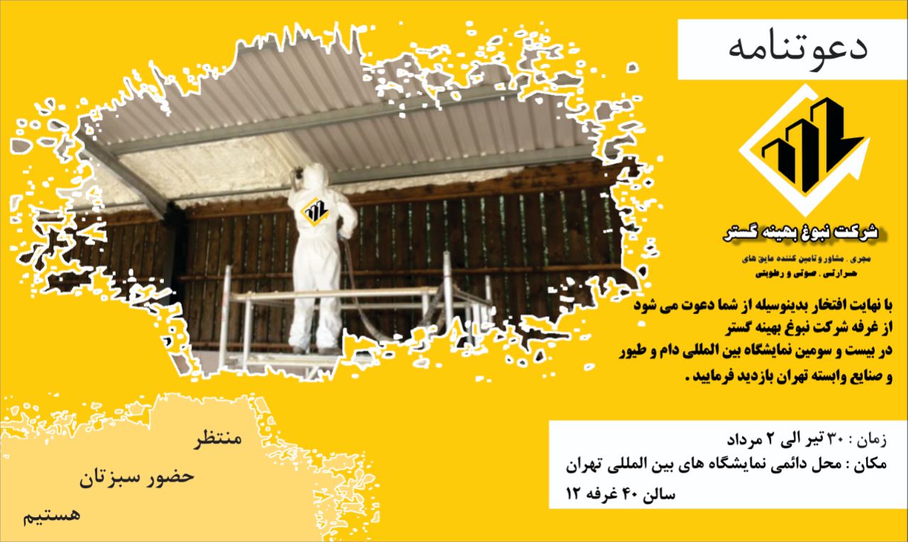 شرکت نبوغ بهینه گستر پیشرو در ارائه محصولات و خدمات عایق پلی یورتان از جمله فوم پاششی، انواع عایق حرارتی، عایق صوتی، عایق فوم پاششی در راستای ترویج استفاده از عایق های نوین و بهینه سازی مصرف انرژی در نمایشگاه بین المللی دام و طیور و صنایع وابسته تهران شرکت می کند.
